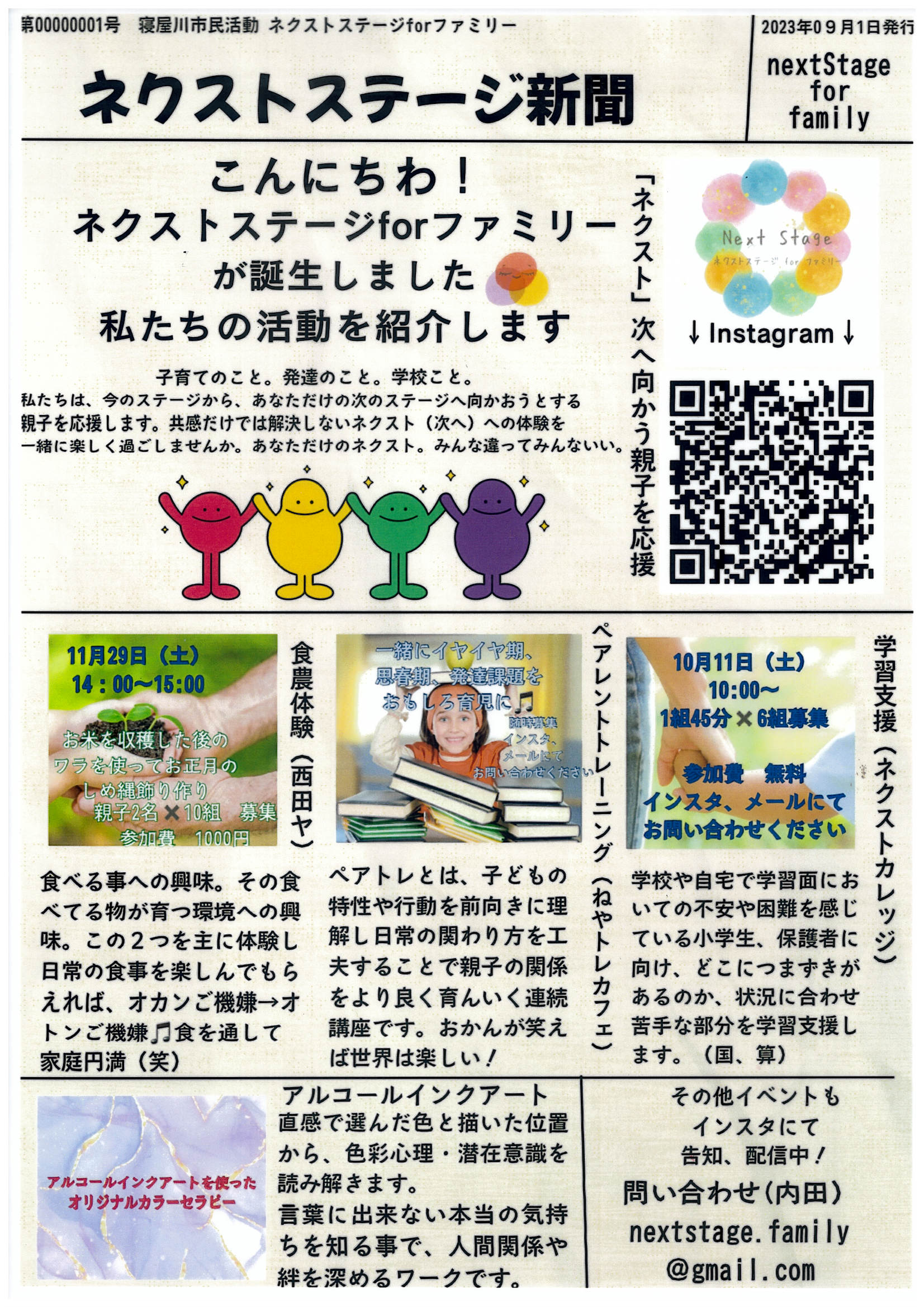 活動内容:親子の絆構築支援(厚労省推進ペアレントトレーニングによる発達支援虐待防止) 児童学習支援(発達おうとつ、不登校等、必要な児童への学習支援) 農業体験(集う親子に活動の場として楽しく農業体験を提供) セラピー(カラーセラピストにより、親子の絆構築の場を提供)