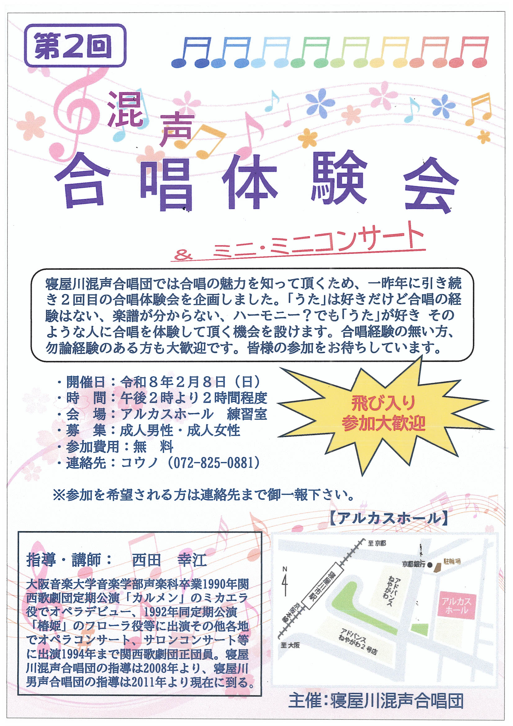活動内容:寝屋川のコーラスの好きな人の集まりで1996年(平成8年)合唱団が結成された。 1年半程度の頻度でコンサートの開催や、寝屋川合唱連盟主催の定期に出演を目標に、エスポアールにて月3回木曜日午後6時30分から2時間練習を行う。 ここ数年若い人の入会が殆どなく、現存の団員は高齢化により退団者が出ており合唱団の運営が非常に厳しい状態になっております。今年3月のコンサートは上述の事情により混声合唱団主催のコンサートの開催が困難になり、寝屋川男声合唱団とジョイントコンサートを開催する予定。団員募集のチラシを配布したり、市の広報に団員募集を出す等して新しい団員獲得に継続して取り組む。